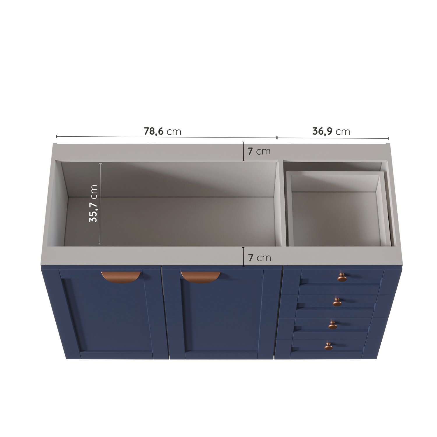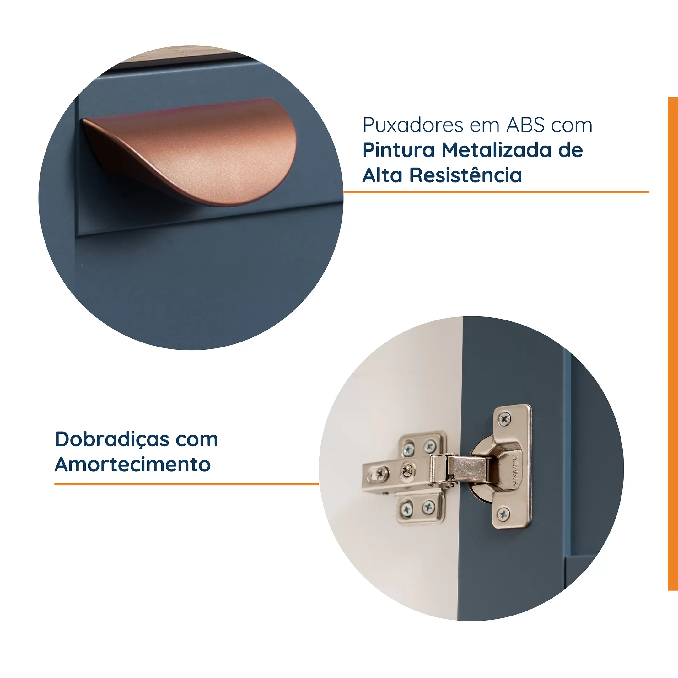 O Balcão de Pia possui design contemporâneo inspirado no estilo americano. Possui fita de borda em PVC, conferindo alta durabilidade e proteção contra umidade ao móvel. As portas e frentes de gaveta são feitas em MDF e possuem acabamento em Finish Foil, além disso as dobradiças possuem amortecimento, possibilitando fechamento de portas “soft closing”e suas corrediças são telescópicas, possibilitando abertura total da gaveta. O Balcão possui rodapé removível em PVC que pode ser instalado facilmente nos pés do produto. A gaveta superior também possui porta talheres em plástico injetado na cor branca, conferindo praticidade e usabilidade no dia a dia!