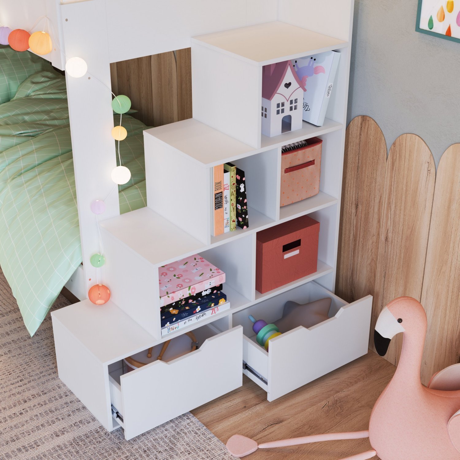 O quarto da sua ou suas crianças ficará ainda mais charmoso com a nossa Cama Beliche. Com escadas laterais, uma praticidade para a subida e descida do seu pequeno. Em cada degrau, nichos que facilitam e otimizam o espaço. Nestes nichos, podes guardar e organizar vários brinquedos, livros e outros acessórios. Nos últimos dois nichos rentes ao chão, duas gavetas que acompanham o produto e o tornam ainda mais completo! Permite a montagem da escada lateral tanto do lado direito quanto lado esquerdo. Opcional em várias combinações de cores, confira! Produto 100% MDP em 15 milímetros de espessura!
