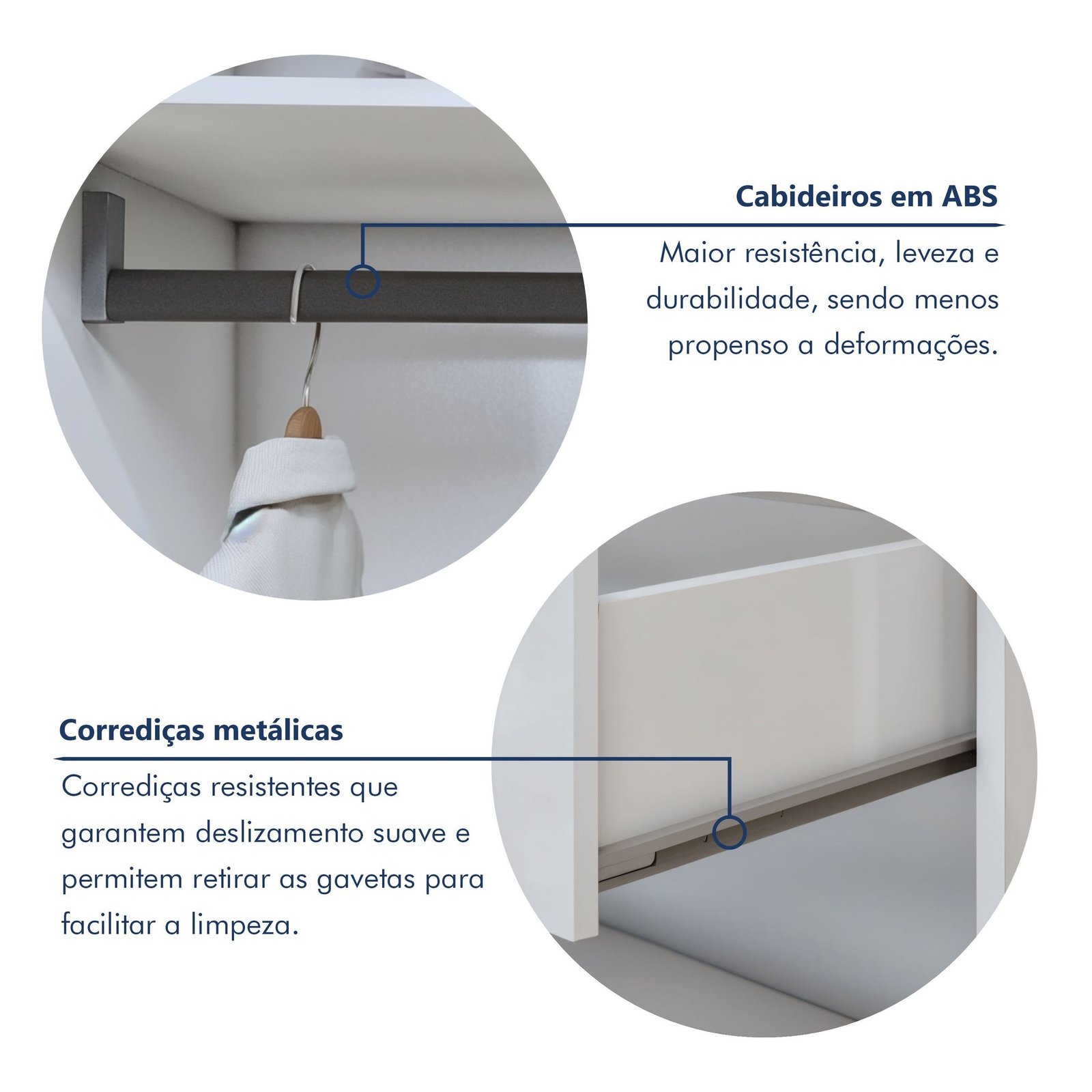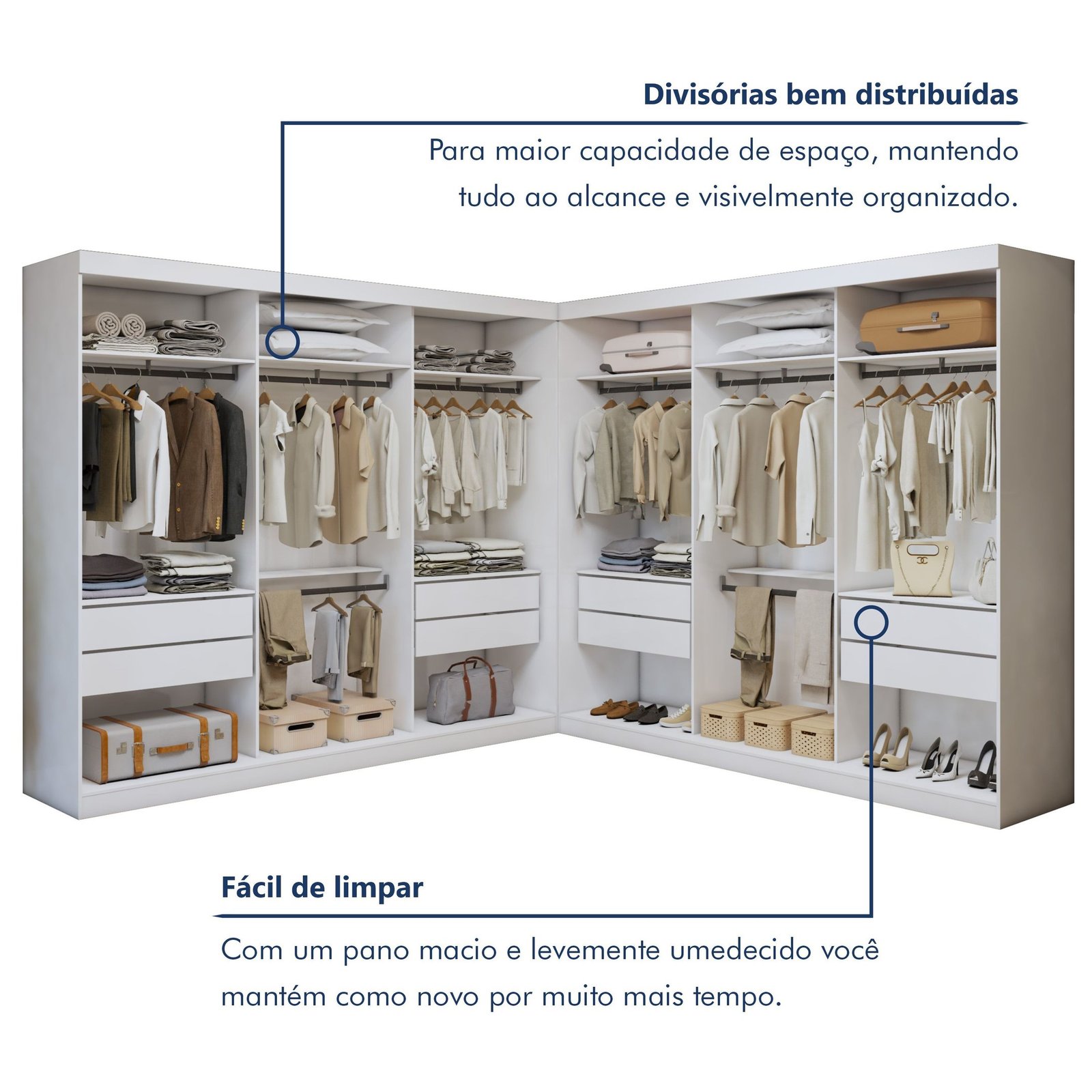 Nosso closet Paris é a escolha ideal para quem deseja um quarto dos sonhos. Perfeito para quem valoriza organização e funcionalidade. Seu design aproveita ao máximo os espaços, com espaço para calçados e roupas dobradas, cabideiros em ABS para peças grandes e gavetas com corrediças telescópicas para acessórios. Seu designer aumenta a luminosidade, deixando o ambiente elegante e organizado. Renove sua decoração para quarto com qualidade e beleza que a Linha Paris oferece e aproveite cada momento.O closet é um guarda roupa sem porta? A principal diferença é o tamanho, sendo o closet um maior, promovendo uma visualização melhor dos itens.