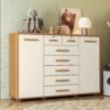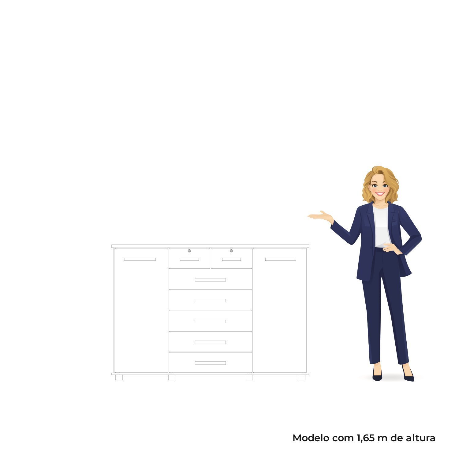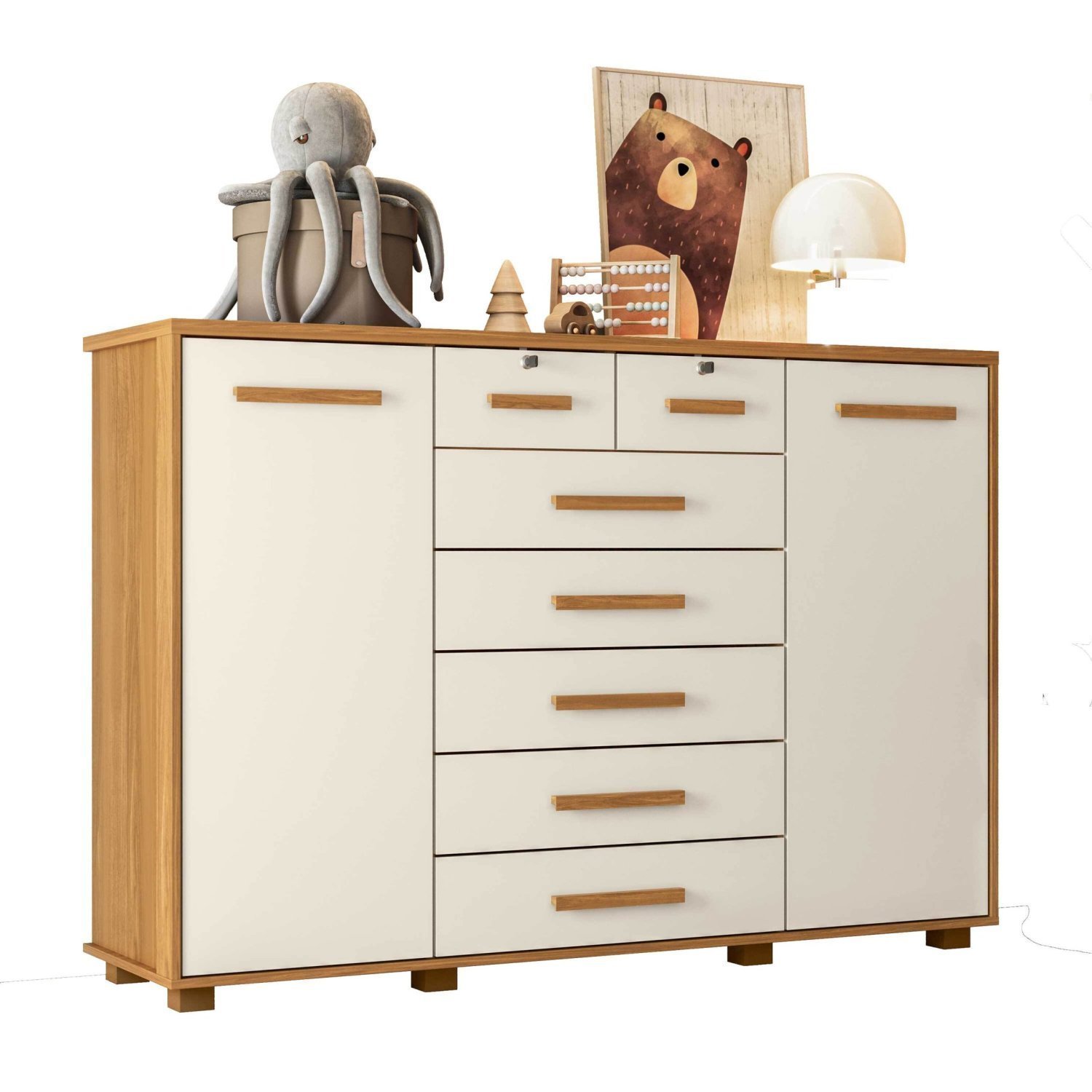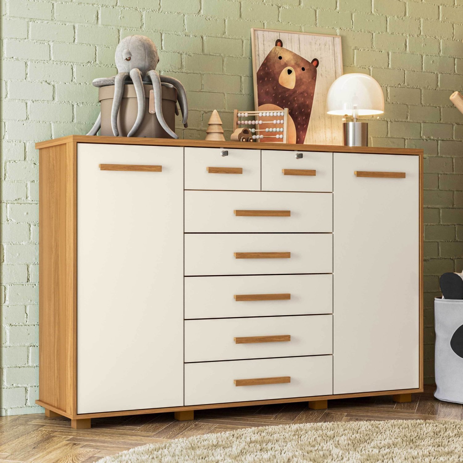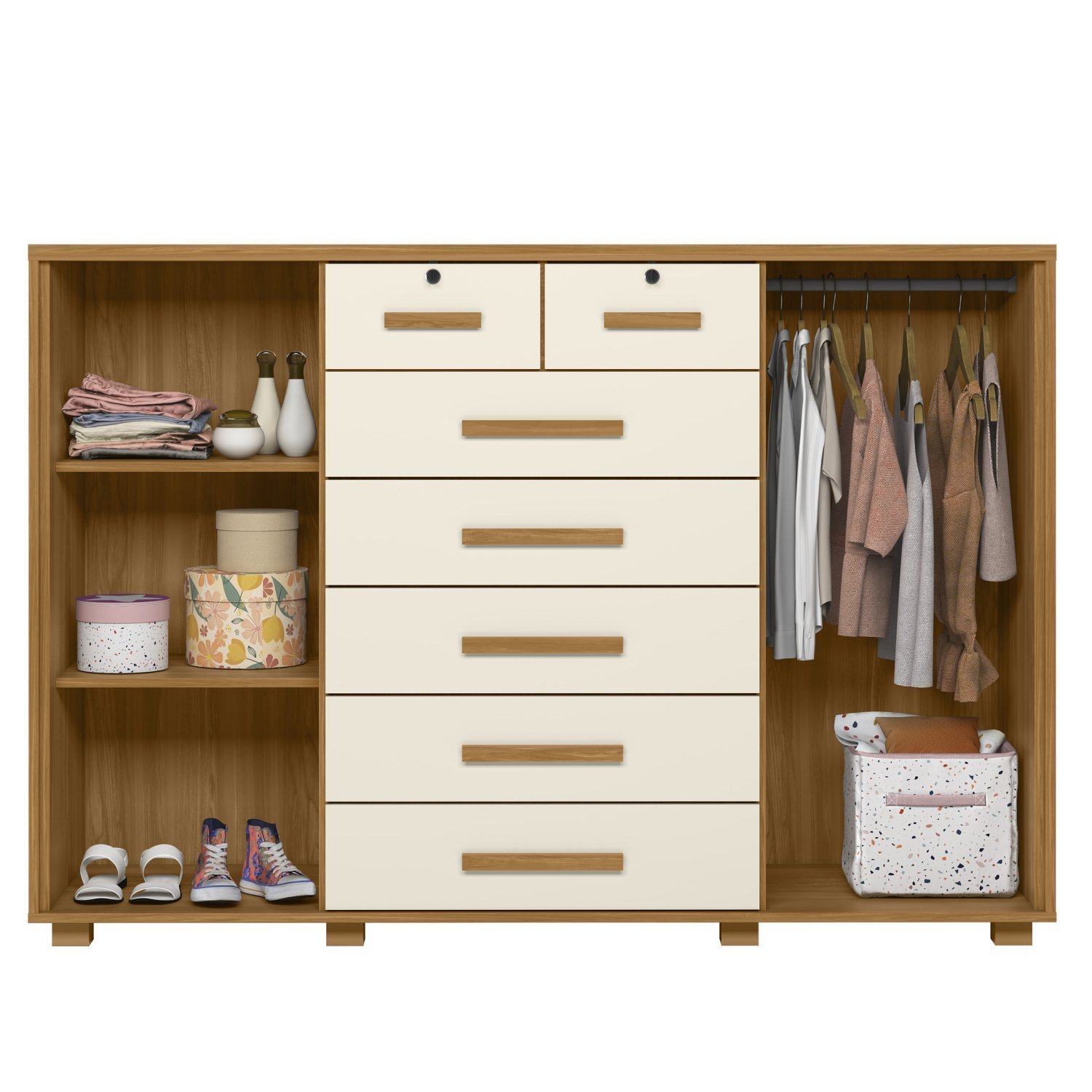 A Cômoda Trapézio é e robusta. Possui 7 gavetas com corrediças telescópicas, sendo as duas menores com chaves e 2 portas, uma com cabideiro e outra com prateleiras. Um produto bem distribuído e completo que irá compor seu quarto.