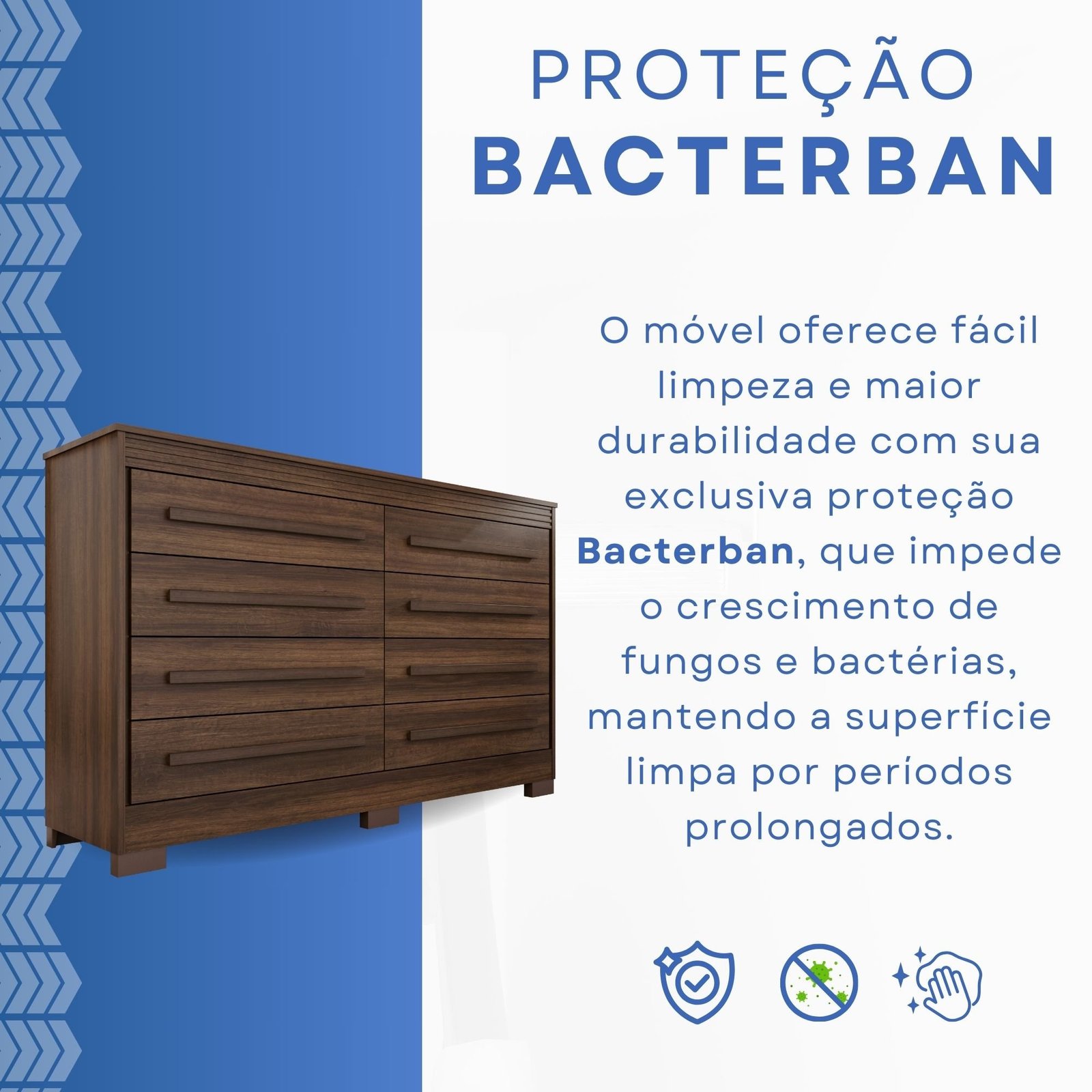 Cômoda com 8 gavetas, fabricada com estrutura de 15mm, garantindo resistência e durabilidade. As chapas em Perfect Wood oferecem alta resistência a fungos e bactérias, garantindo mais higiene e durabilidade. A tecnologia de termo-fusão reforça a estrutura, proporcionando maior resistência ao uso diário. Um material inovador que une qualidade, segurança e longa vida útil. Gavetas espaçosas permitem armazenar roupas, acessórios e diversos itens com praticidade. Perfeita para complementar qualquer ambiente com elegância e utilidade.