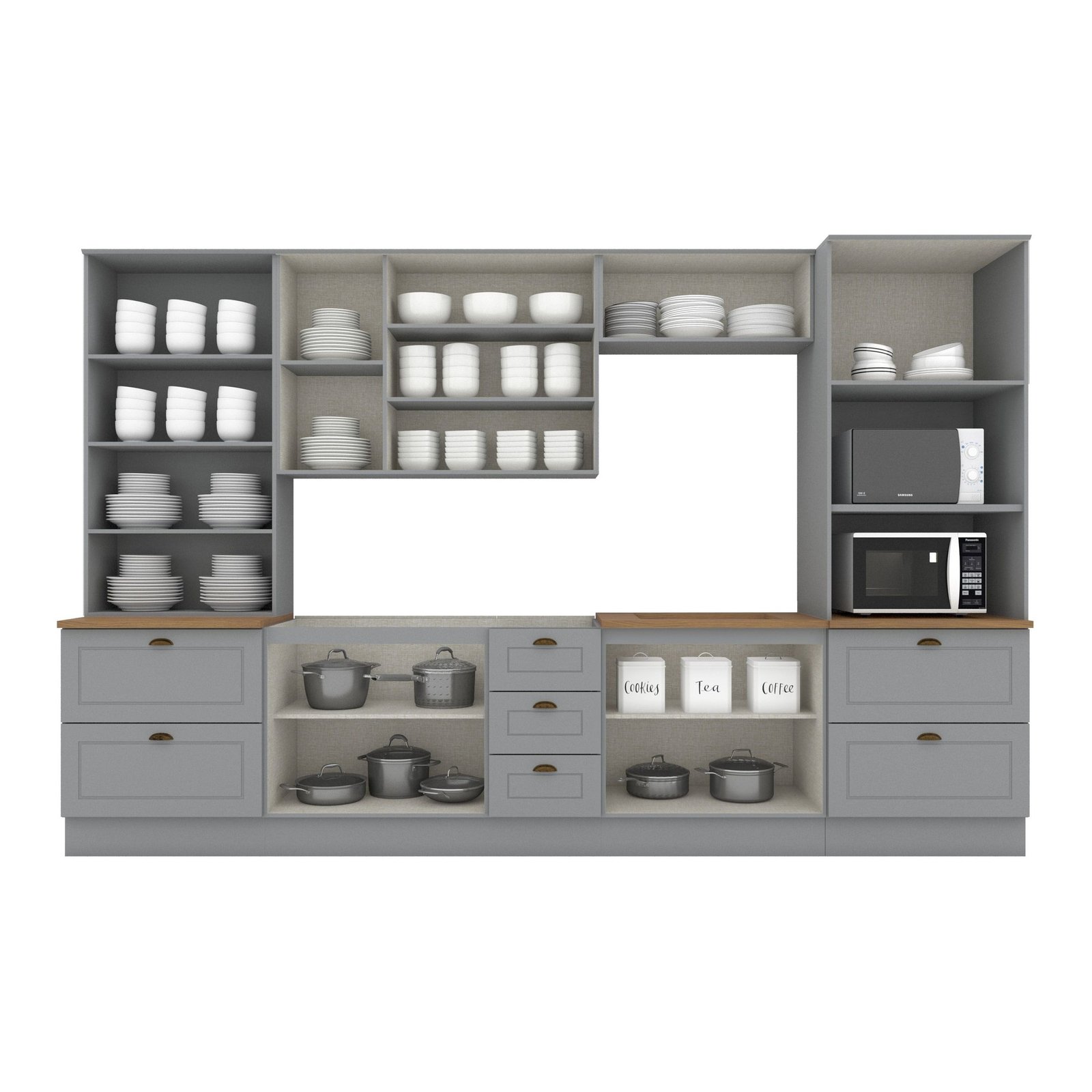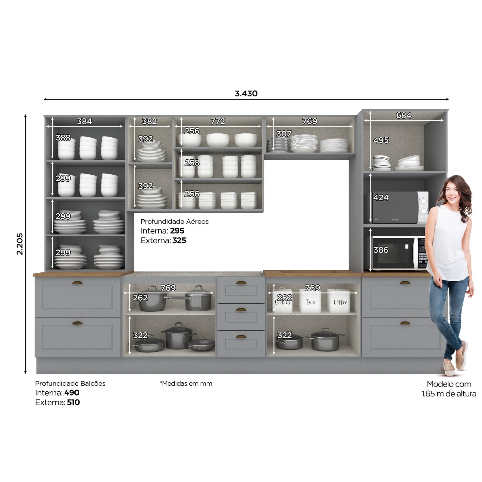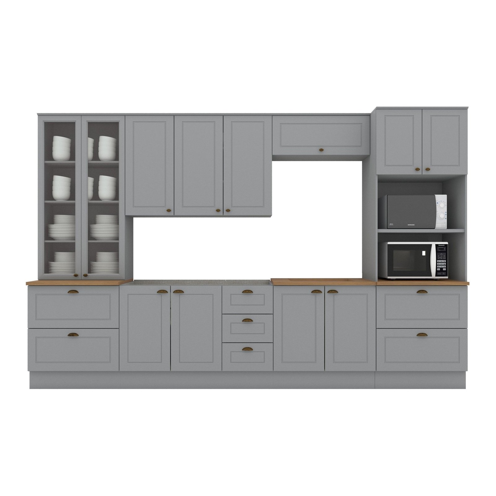 A Cozinha Completa Emily 6 peças com Cristaleira possui 220,5 cm de Altura, 271,5 cm de Largura e 53,5 cm de Profundidade. Um novo conceito inspirado nas clássicas cozinhas estilo americano, seu design contemporâneo embeleza qualquer ambiente. Projetado para proporcionar praticidade e funcionalidade ao uso. Produto 100% MDF, possui detalhes usinados em baixo relevo nas portas e gavetas, puxadores nos balcões em formato de concha e nos aéreos são pontuais, ambos na cor ouro velho, possui dobradiças de 35mm com amortecimento, gavetas com corrediças telescópicas proporcionando maior abertura. A sua instalação pode ser feita tanto com o uso dos rodapés ou suspensa.