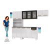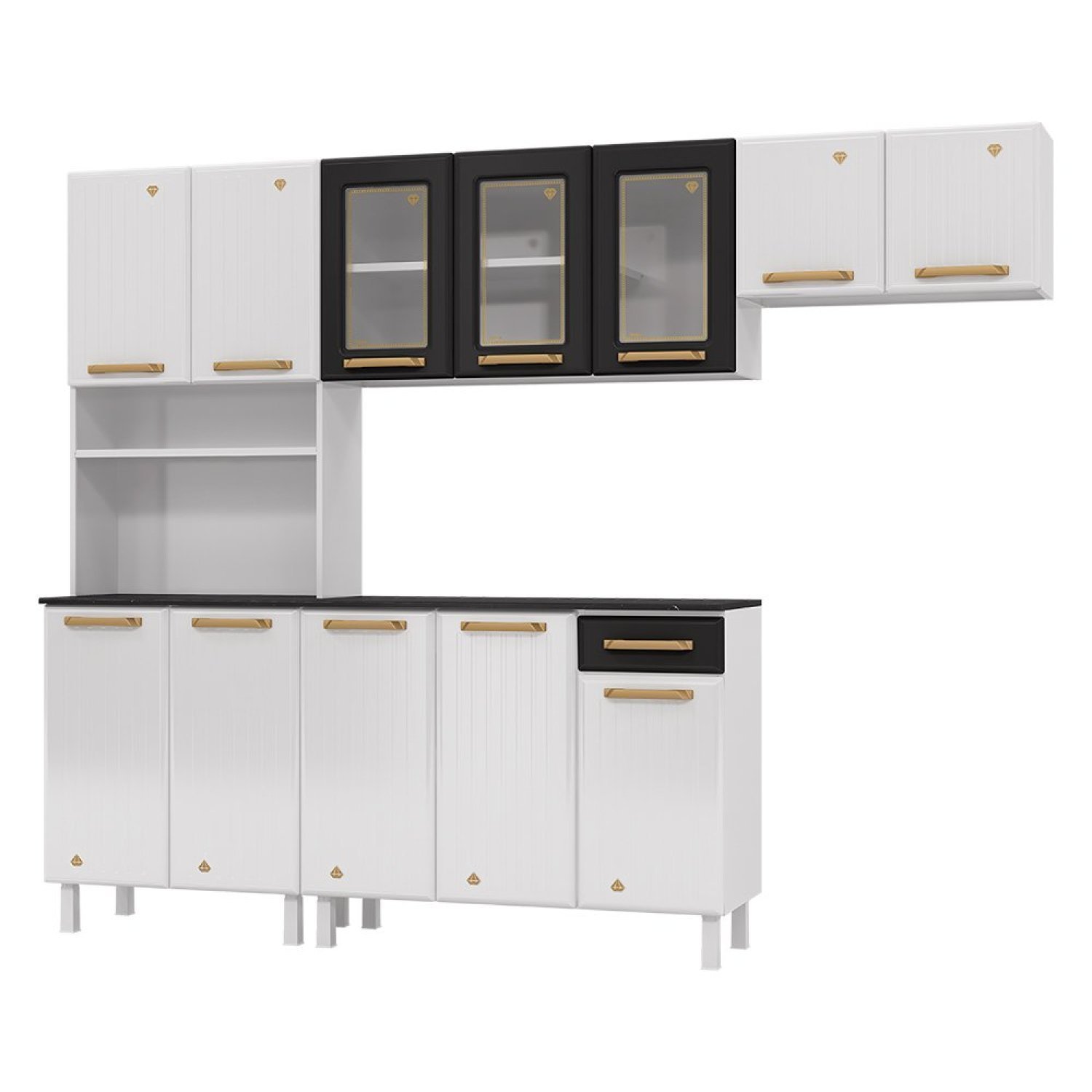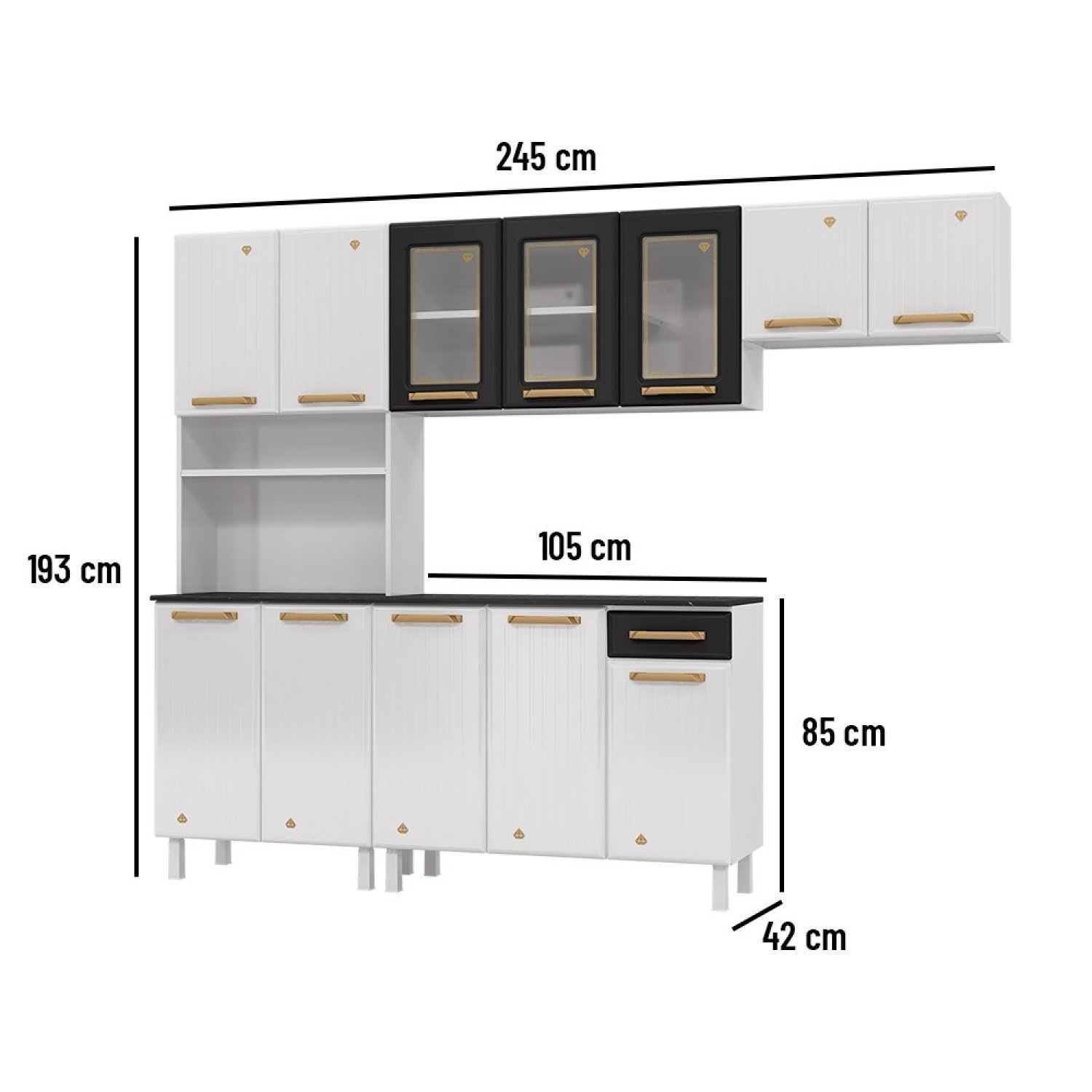 A linha Diamante é aposta certa para trazer mais praticidade, resistência e brilho para a sua cozinha. Essa composição conta com 3 módulos robustos – fabricados inteiramente em aço – que passam por pintura eletrostática de acabamento brilhoso, um processo que confere qualidade, proteção anticorrosiva e mais resistência ao móvel. Internamente, é possível acomodar panelas, louças, travessas ou alimentos – de maneira organizada e muito funcional. O módulo Kit é um grande aliado aqui: possui espaço reservado para micro-ondas, forno ou qualquer eletro que você precise ter sempre ao alcance das mãos – de forma prática e ergonômica. O Armário aéreo é um daqueles itens queridinhos para armazenar e também decorar a cozinha, além dos belos vidros serem serigrafados e temperados, para maior segurança. O Balcão é outro coringa tanto para organização quando preparo das refeições; ele possui uma gaveta que pode acomodar talheres e utensílios para que estejam sempre à mão. A estrutura interna desta gaveta é de plástico muito rígido, resistente e fácil de lavar. As delicadas linhas verticais das portas desta cozinha – inspiradas na tendência atual da decoração – em combinação com o aplique em alto relevo do “diamante” e o belo puxador em tom dourado, fazem o ambiente brilhar. Complemente essa cozinha outros itens da mesma linha para criar o ambiente dos seus sonhos.