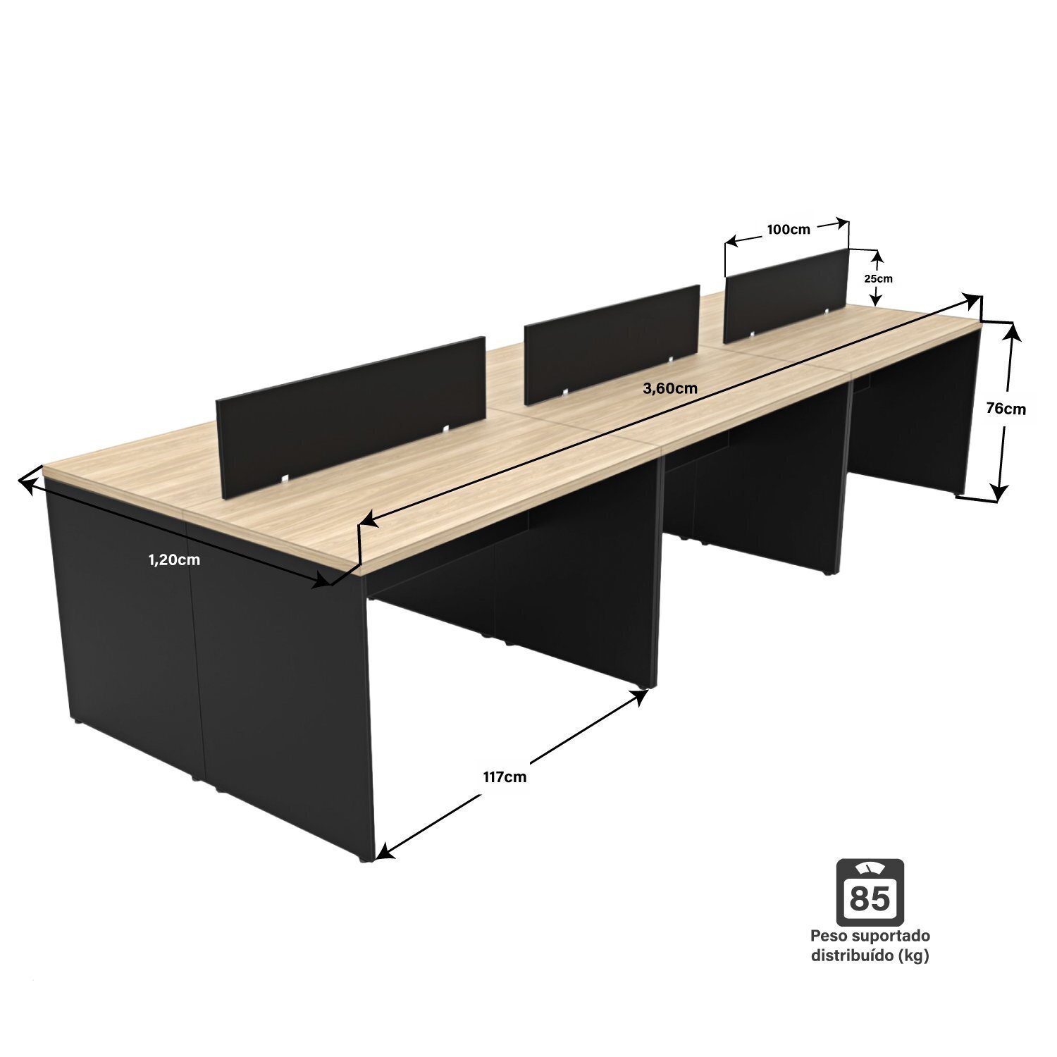 Dimensões do conjunto completo: Altura: 101 cm | Largura: 360 cm | Profundidade: 120 cm Material: MDP e ABS Peso: 132kg Peso suportado (distribuídos por mesa): 85kg (tampo). Certifique-se das características do produto. – Verifique as medidas. – Subida ou descida de escadas/elevadores: A empresa não se responsabiliza por este serviço. – Variação de cores: As cores podem sofrer variações devido à resolução da tela, calibração de cores e iluminação do ambiente. – Objetos decorativos: Objetos decorativos não acompanham o produto. – Condições da embalagem: Ao receber o produto, verifique as condições da embalagem. Em caso de avarias, entre em contato conosco. – Discrepâncias: Em caso de discrepâncias entre o produto recebido e a descrição do pedido ou da nota fiscal, entre em contato conosco.