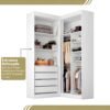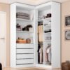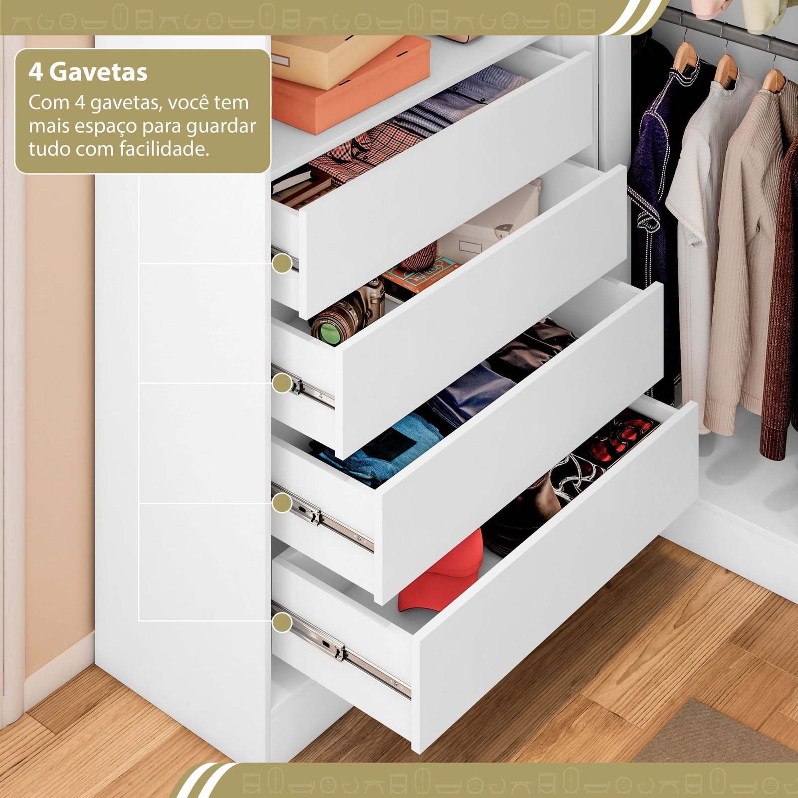 Closet Casal Versatille – Em L de Canto, Sem Portas Moderno, funcional e ideal para quem busca praticidade com estilo, o Closet Casal Versatille é a escolha perfeita para quartos de casal. Seu formato em L de canto aproveita melhor o espaço disponível, garantindo organização sem comprometer a circulação no ambiente. Com design aberto, sem portas, proporciona acesso rápido e fácil às roupas e objetos do dia a dia. Conta com 4 gavetas internas com corrediças telescópicas, que deslizam suavemente e dispensam puxadores para um visual mais limpo e contemporâneo. Possui ainda 3 cabideiros, 7 prateleiras e 9 nichos, ideais para acomodar roupas, sapatos, bolsas e itens decorativos de forma prática e organizada.