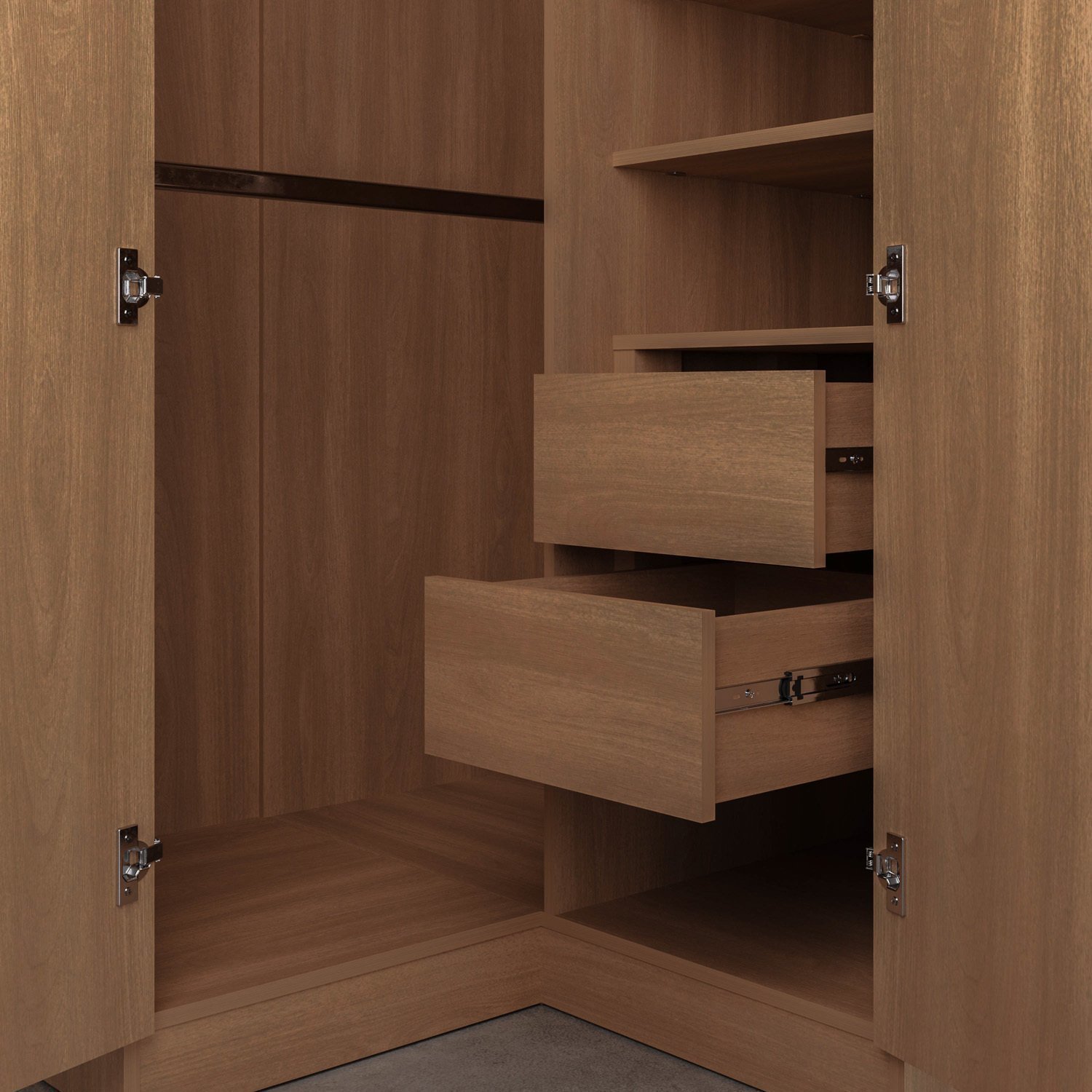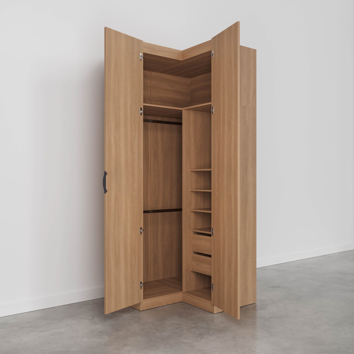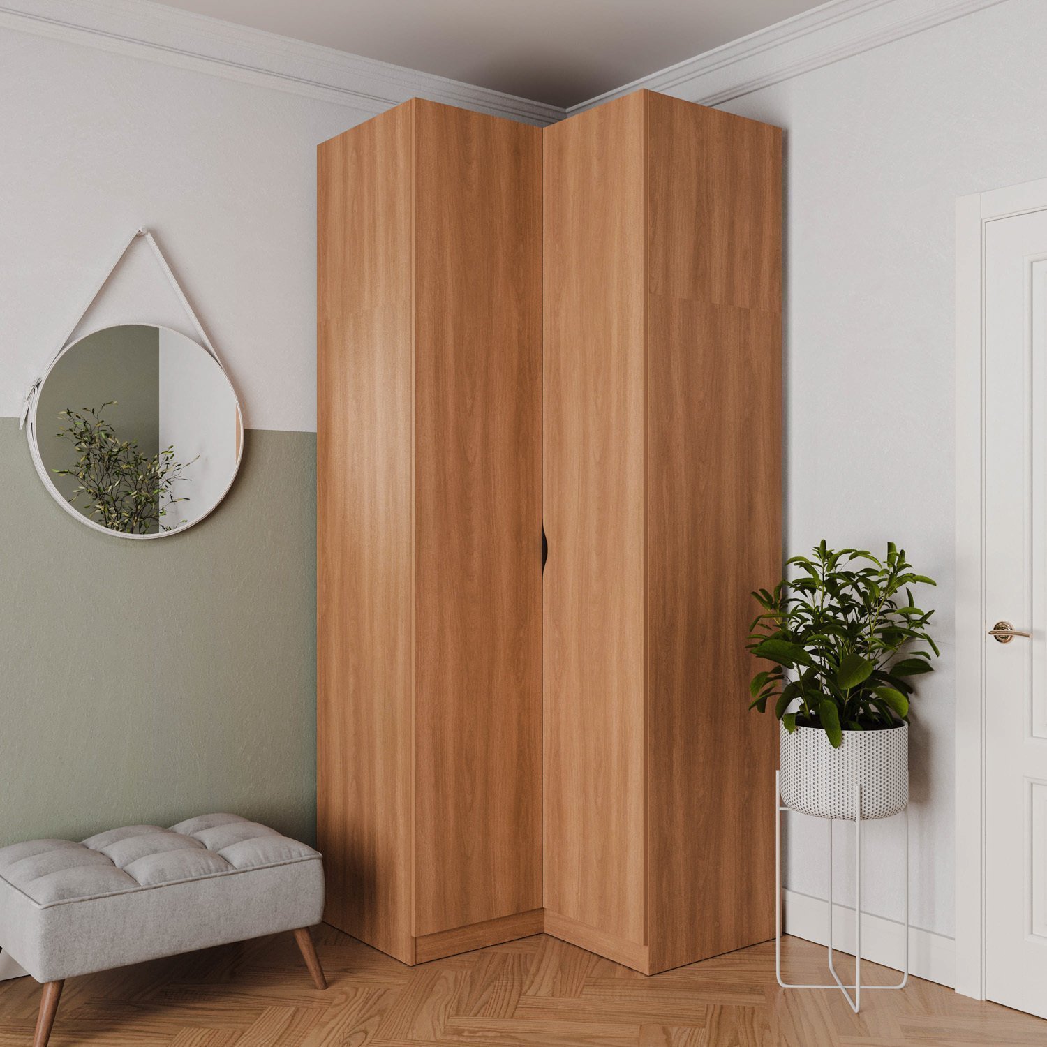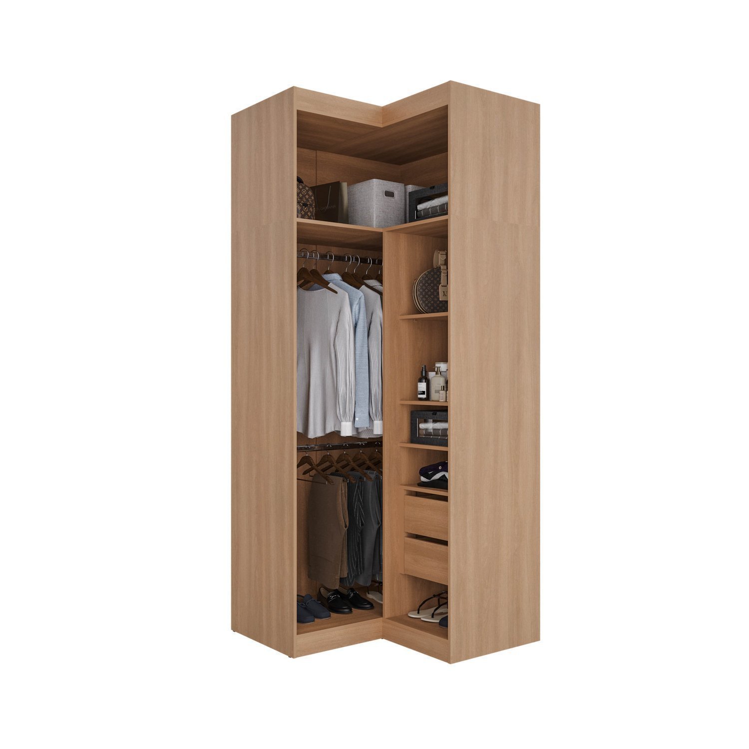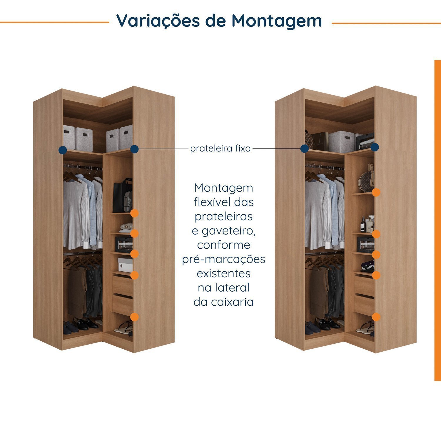O Guarda Roupa Modular de Canto Reto Hera foi desenvolvido para trazer a experiência de ter seu móvel customizado de acordo com a necessidade do seu espaço. O móvel conta com um gaveteiro de 2 gavetas, 1 kit com 3 prateleiras e 3 cabideiros que podem ser selecionados e ajustados conforme a pré marcação na caixaria, evitando assim problemas para nivelamento dos mesmos. Com essa proposta, oferece para seus clientes a possibilidade prática e custo-benefício em oferecer uma linha de modulados que faça a função de um móvel planejado. O cliente pode escolher entre os sete módulos disponíveis, em diferentes variações de acabamentos, os que mais se adaptam ao seu gosto e ao seu dia a dia. Além disso, conta com design moderno que irá trazer muito mais sofisticação e aconchego para a decoração.
