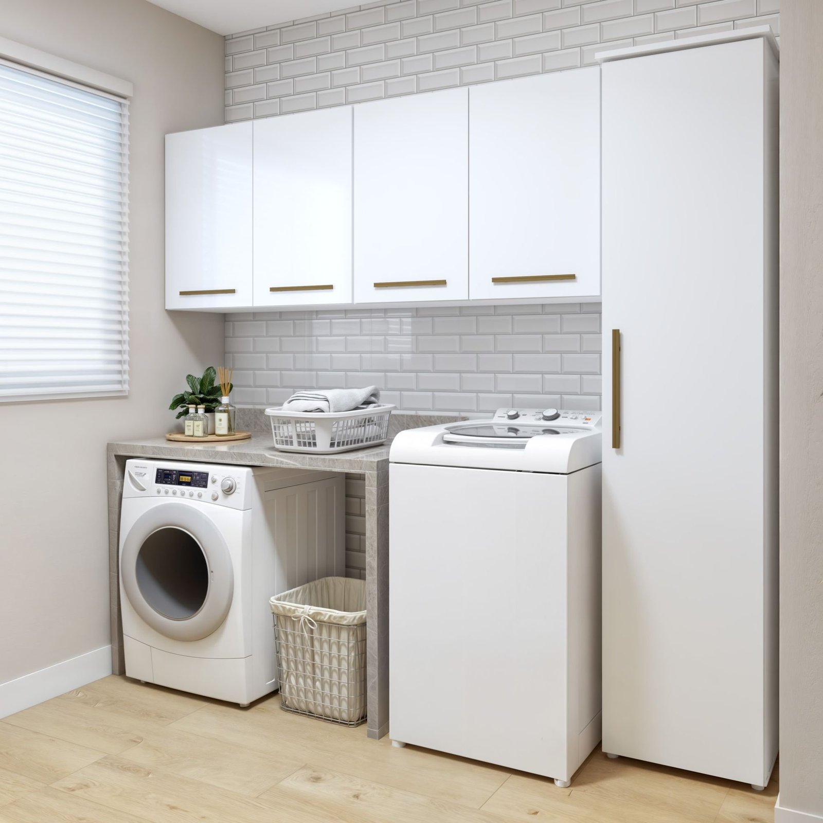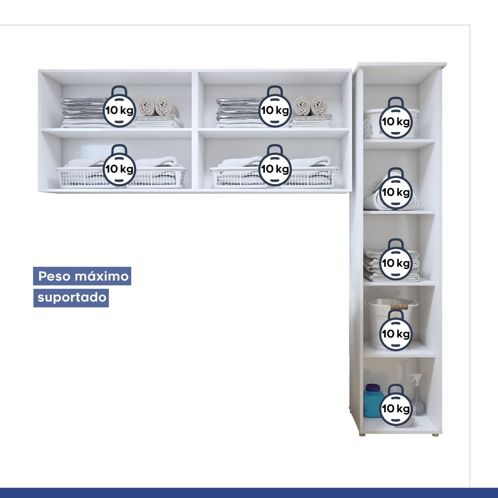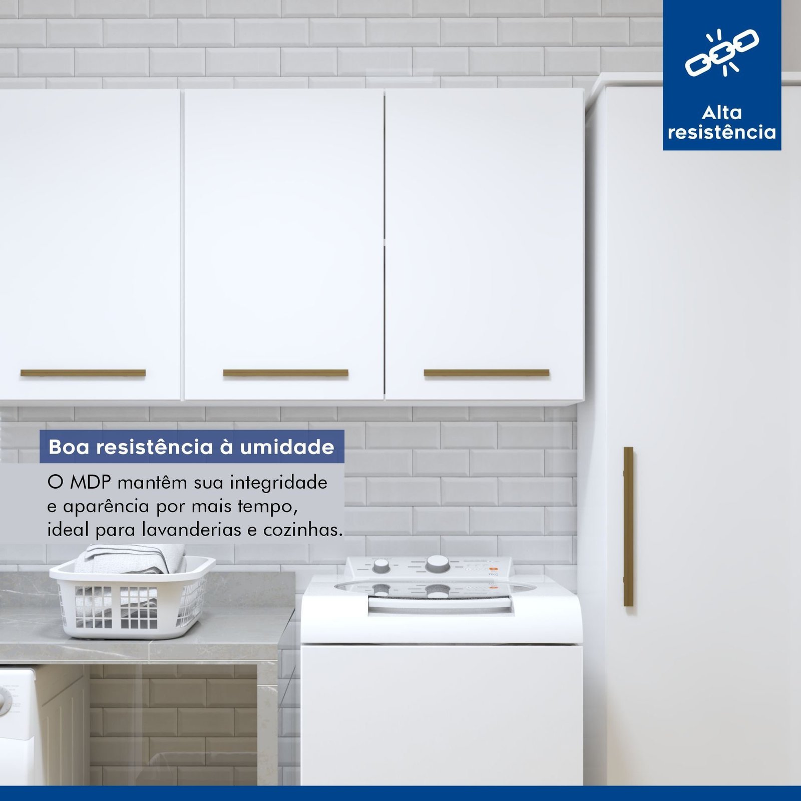 Nosso conjunto de móveis para área de serviço é ideal para quem deseja otimizar a área de serviço com organização e praticidade. Oferece amplo espaço para armazenar produtos de limpeza, ferramentas e outros itens, aproveitando tanto o espaço vertical quanto o chão. Os armários aéreos ajudam a liberar espaço no ambiente, mantendo tudo bem organizado e acessível. Com um design moderno e resistente, o conjunto combina funcionalidade e estilo, trazendo mais eficiência ao seu dia a dia!Quais são os melhores armários para lavanderia pequena? Os melhores modelos são armários com prateleiras que otimizam espaço e ajudam a organizar produtos e utensílios de forma prática.Posso usá-lo como armário de cozinha? Claro, basta usar a criatividade e conseguirá usar em vários ambientes.