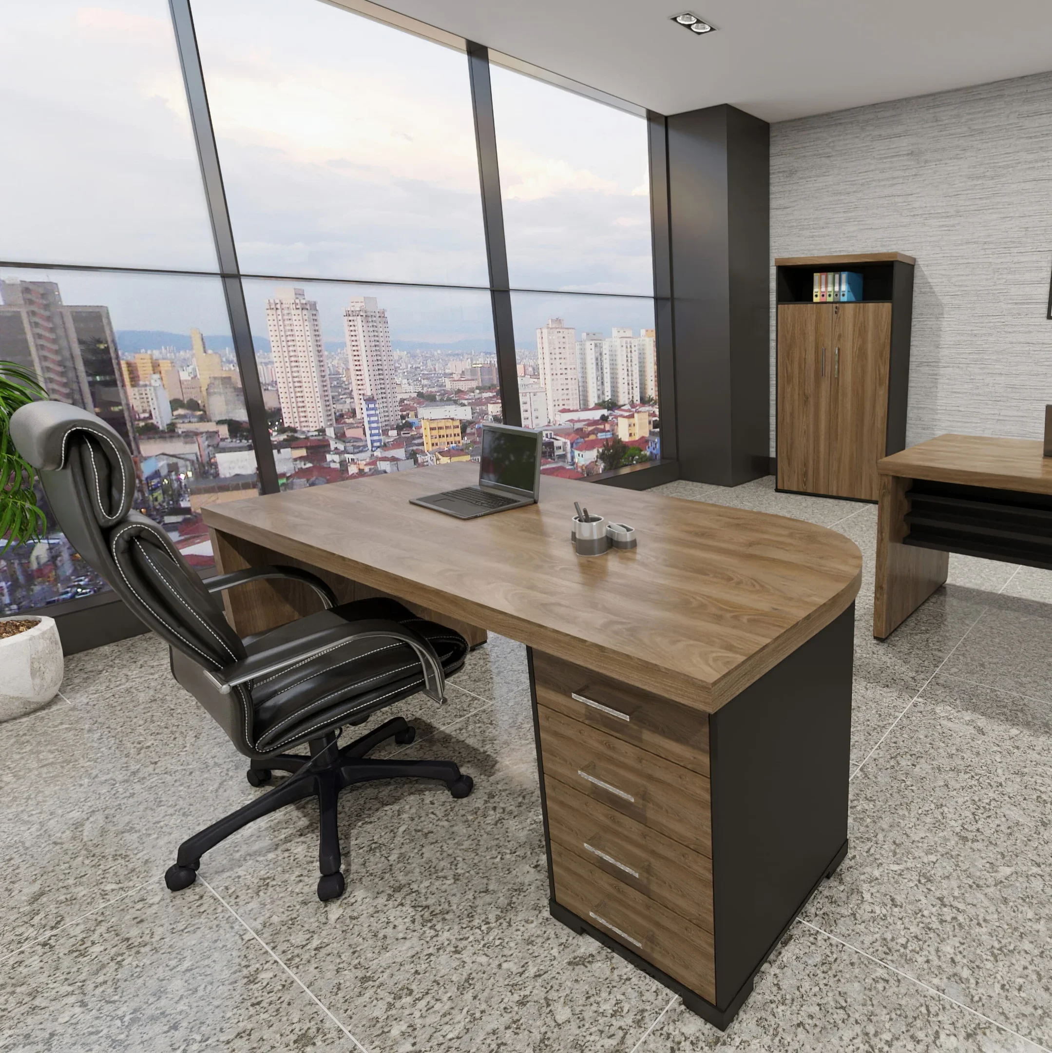 Transforme seu escritório em um espaço verdadeiramente moderno e funcional com a Mesa Tamburato com Gavetas! Projetada para elevar o ambiente corporativo, esta mesa é o complemento ideal para aumentar o conforto e a sofisticação enquanto impulsiona sua produtividade.Com um generoso tamanho que prioriza seu bem-estar, oferece uma ampla superfície de trabalho. Mas não para por aí! O gaveteiro integrado com 4 gavetas, todas com travas, garante uma organização impecável e segurança para seus documentos e pertences.Esta mesa assegura a qualidade e a robustez de móveis de alto padrão, enquanto seu design elegante e versátil a torna adequada para diversos ambientes, desde escritórios a espaços de estudo e home office.Descubra o equilíbrio perfeito entre praticidade, qualidade e estilo.