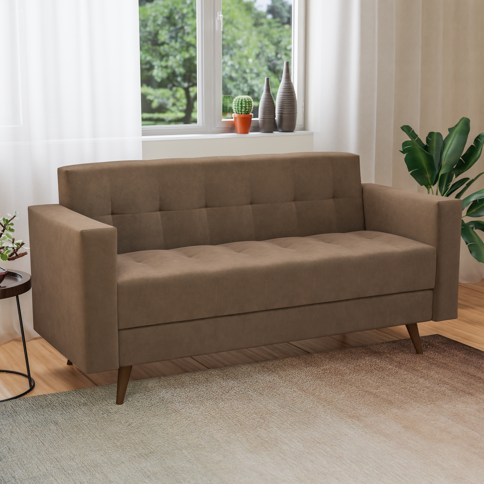 Sofá fixo com estrutura em madeira de eucalipto e pinnus, composto com percinta elástica, manta siliconada e espuma d23. Revestido com tecido suede tabaco. Pés de madeira na cor tabaco. Tem como principal característica o conforto e o estilo retrô.